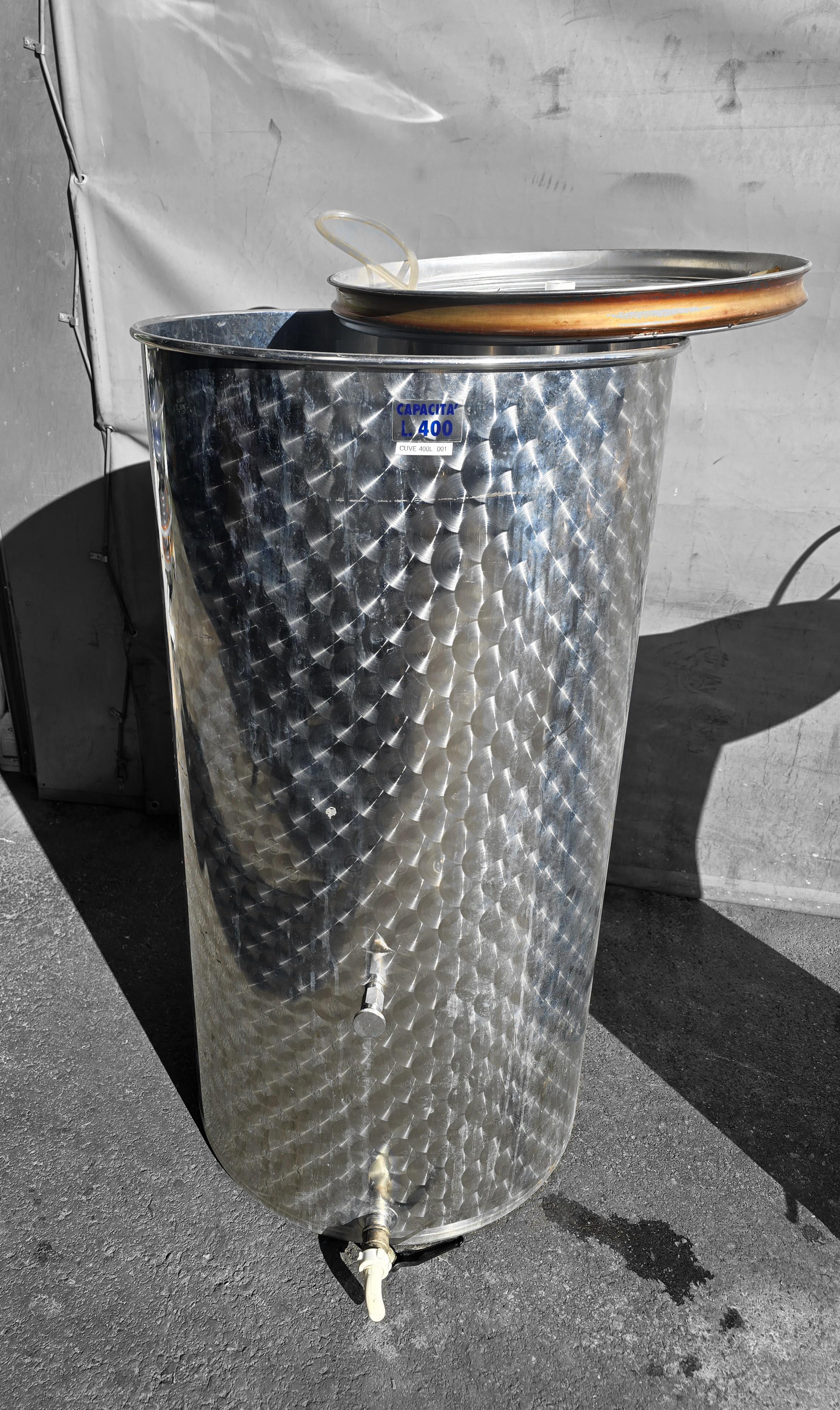 Cuve bouchonnée de 400L, chapeau flottant, avec un dégustateur et une vanne 3/4.