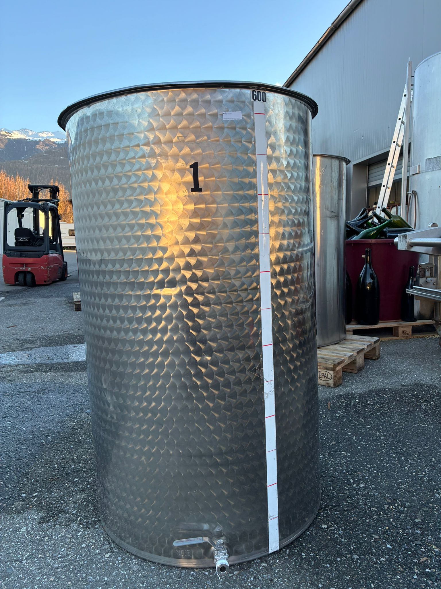 Cuve de 600L, ronde, en Inox, bouchonnée, constituée d'une vanne un pouce.