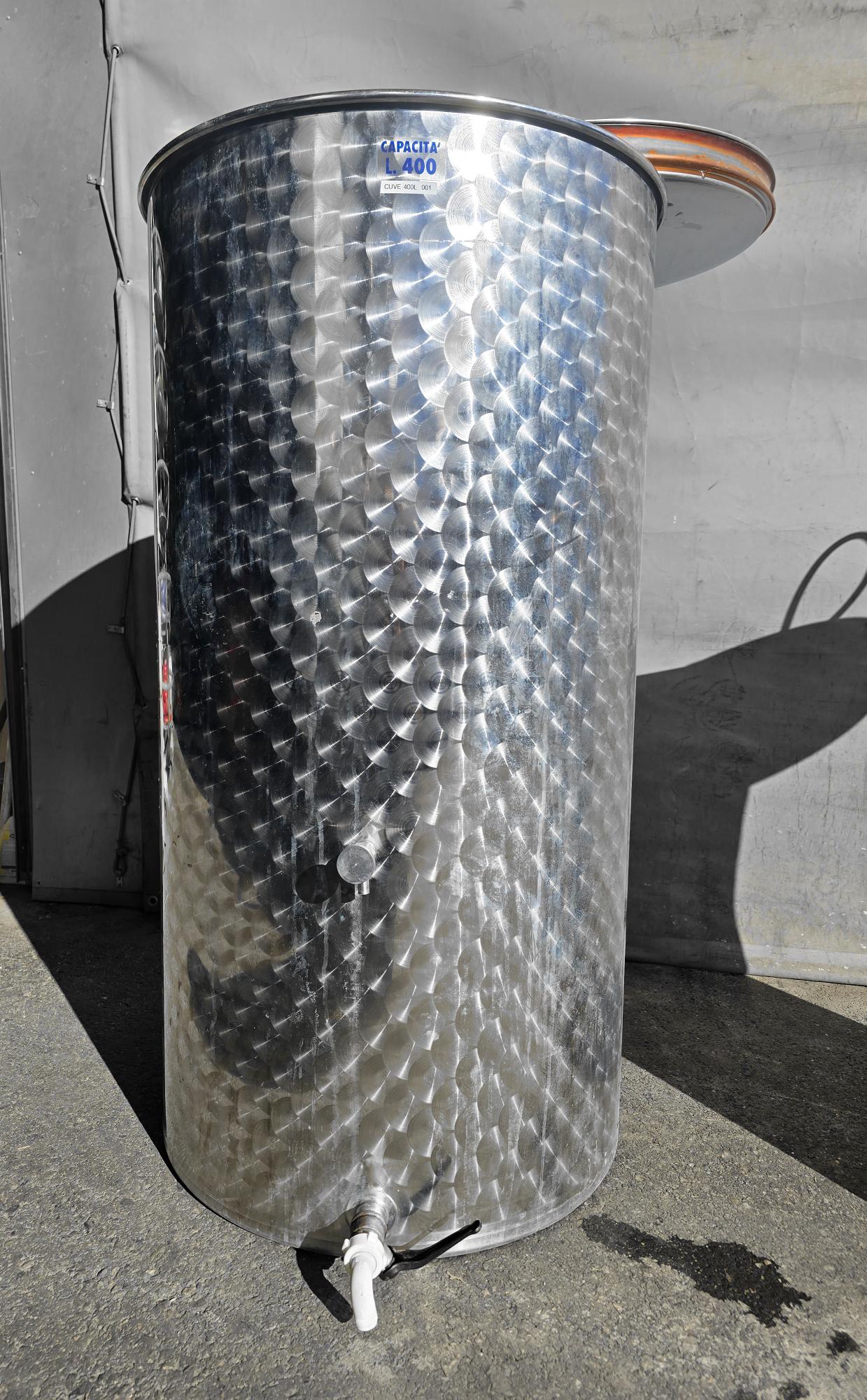 Cuve bouchonnée de 400L, chapeau flottant, avec un dégustateur et une vanne 3/4.